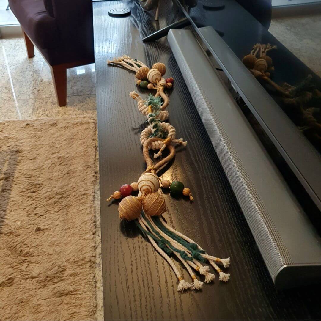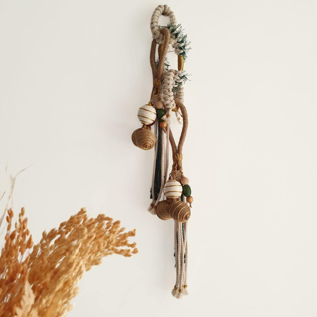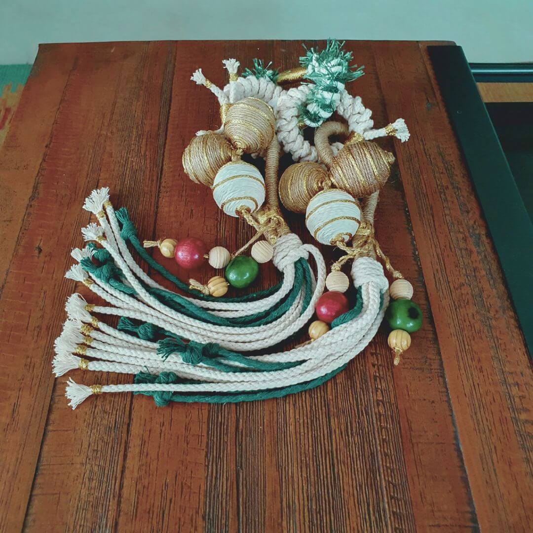 Cor: corda de algodão na cor cru; barbante de algodão na cor verde; bolas revestidas com rami na cor natural e rafia de papel cor cru; bolinhas de madeira na cor natural e avermelhado; detalhes e acabamentos na cor dourado e semente de jarina na cor verde.