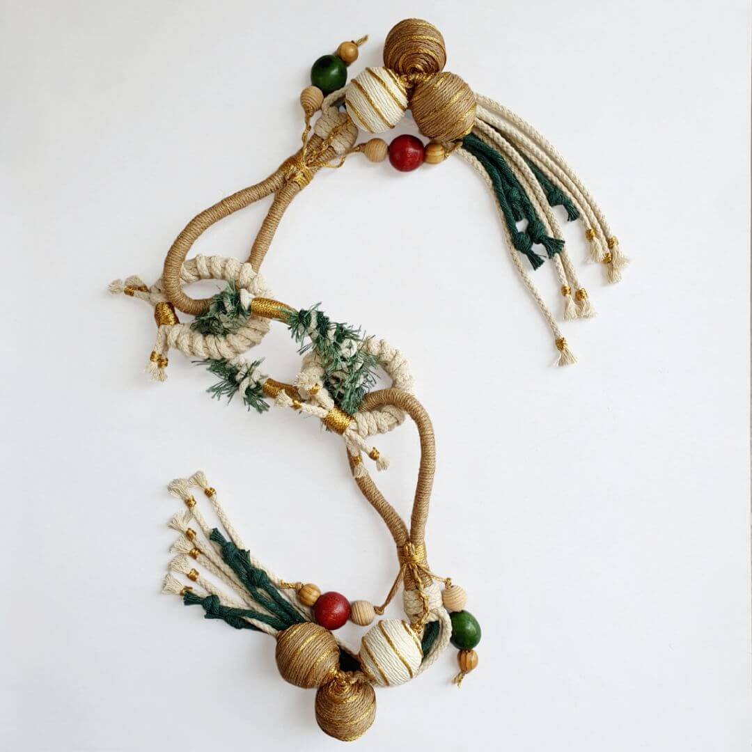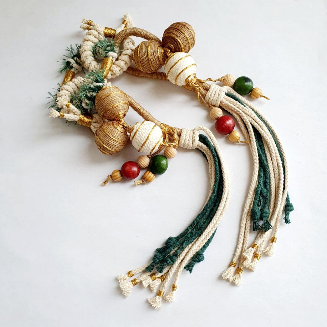 Materiais: cordas de algodão e barbante de algodão reciclado; bolas de isopor revestidas com Rami e rafia de papel; bolinhas de madeira e sementes de jarina; detalhes e acabamentos feitos com fios de viscose.