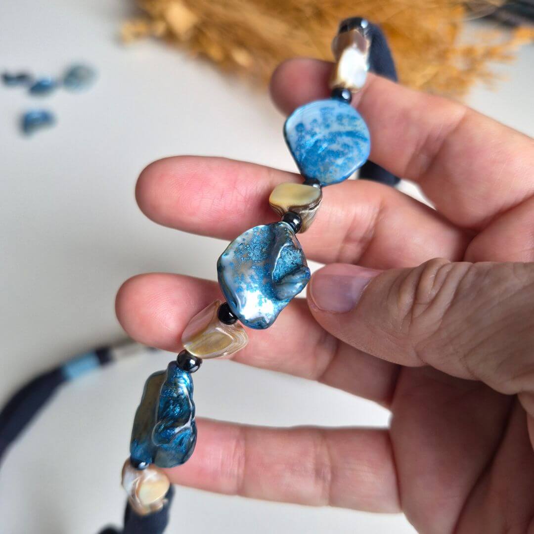 Material: Fio de malha, fios de algodão encerado, madrepérolas azuis e naturais, miçangas de hematita e fechamento de metal imantado.