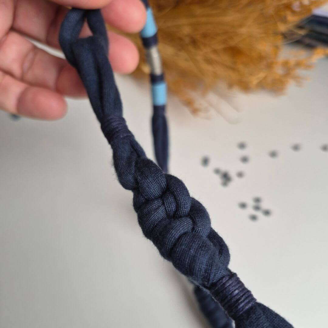 Colar em Macramê feito com fio de malha ecológico e detalhes em fio de algodão. Possui madrepérolas azuis e naturais intercaladas com hematitas. Fechamento de metal imantado