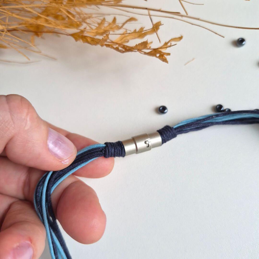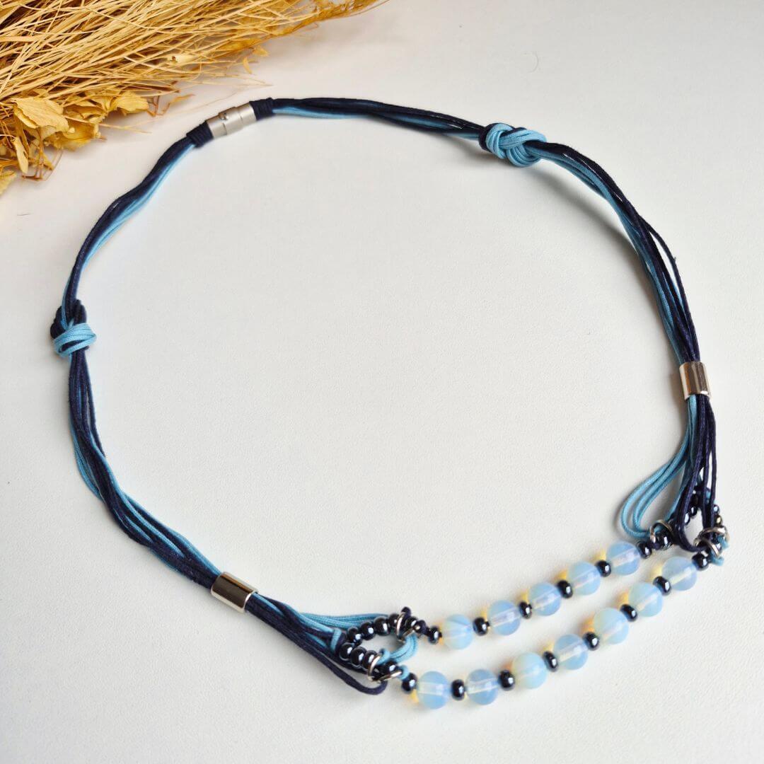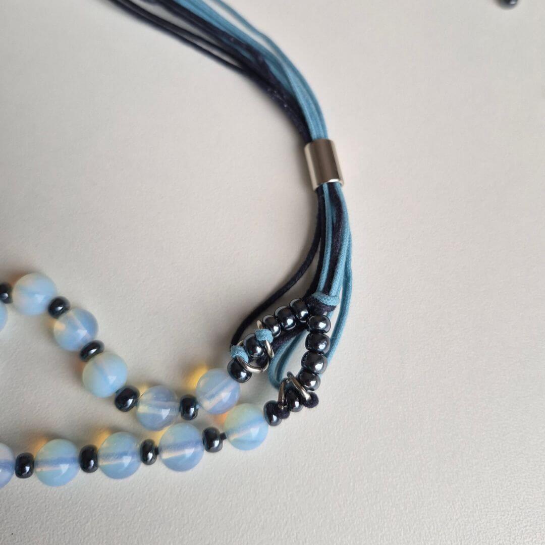 Material: fios de algodão encerado, Pedras da Lua, miçangas de hematita, entremeios e argolas de metal; e fechamento de metal imantado.